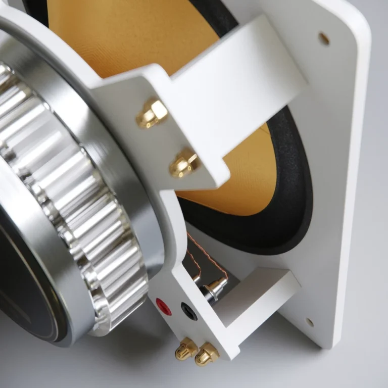 La bobina mobile è completamente sospesa con un’escursione di +- 3 mm al 100% dell’intensità del magnete. L’escursione massima è di +/- 6 mm. La linearità e la riduzione delle distorsioni sono ai massimi livelli. Al fine di mantenere una tolleranza di 0,01 mm su tutti gli elementi, i componenti magnetici del motore sono prodotti utilizzando torni CNC controllati da computer.